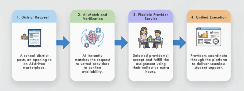 Imagine if districts could tap those “extra hours” through a vetted, AI-powered marketplace. A system that matched real-time school requests with qualified providers in their state. A model like this wouldn’t replace full-time roles; it would expand capacity, reduce burnout, and bring talent back into the system.
