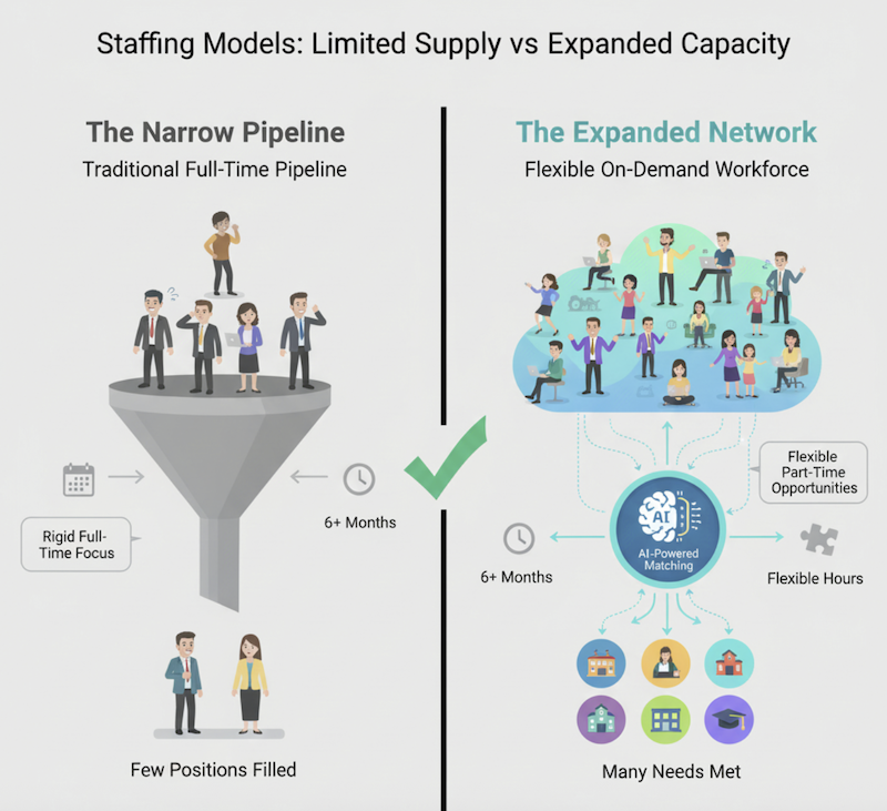 Traditional staffing firms focus on long-term contracts lasting six months or more, which makes sense for stability, but ignores an enormous, untapped workforce: thousands of credentialed professionals who could contribute a few extra hours each week if the system made it easy.