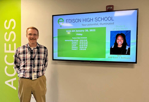 Currently, Edison uses three screens with Rise Vision. Two are fully engaged in student-oriented messaging. The third is located near the school president’s office, where visitors, including donors, may be waiting or passing by en route to a meeting with senior school staff. This screen is used to display schedules when no visitors are expected. Content can be tailored to visitors’ interests.