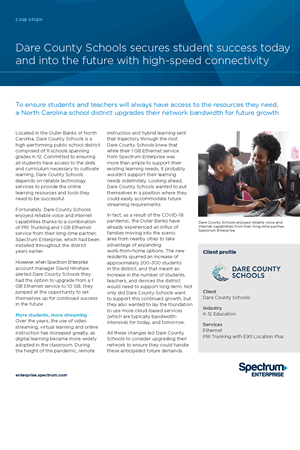 Located in the Outer Banks of North Carolina, Dare County Schools is a high-performing public school district comprised of 11 schools spanning grades K-12. Committed to ensuring all students have access to the skills and curriculum necessary to cultivate learning, Dare County Schools depends on reliable technology services to provide the online learning resources and tools they need to be successful.