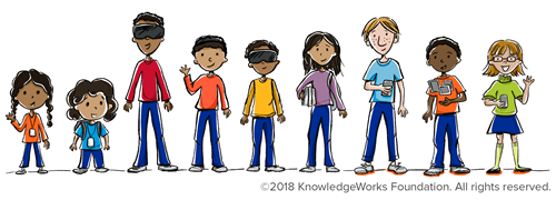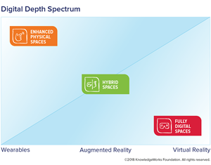 KnowledgeWorks’ strategic foresight publication, Leveraging Digital Depth for Responsive Learning Environments: Future Prospects for Wearables, Augmented Reality, and Virtual Reality, explores how wearables, AR, and VR might be used to create responsive learning environments that can help with the cultivation of social-emotional skills. The publication proposes that educators think about possible uses of wearables, AR, and VR by first considering the types of environments these technologies can create and how they might support student learning. To help educators think about possibilities for these technologies in learning the paper presents a framework called the digital depth spectrum which consists of three kinds of spaces:
