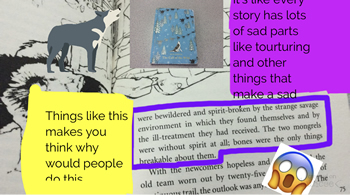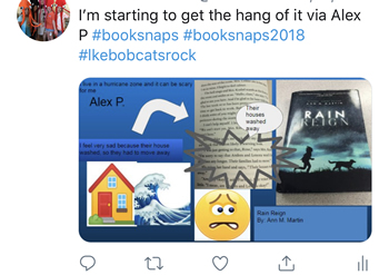 I like to do book snaps with my students, which I found on Twitter through Tara Martin, the author of a book called Be Real. To do a book snap, students take a snippet of a book page, and they can include emojis, the page number, the name of the book, and the cover. Then they write a little blurb and we tweet that out.
