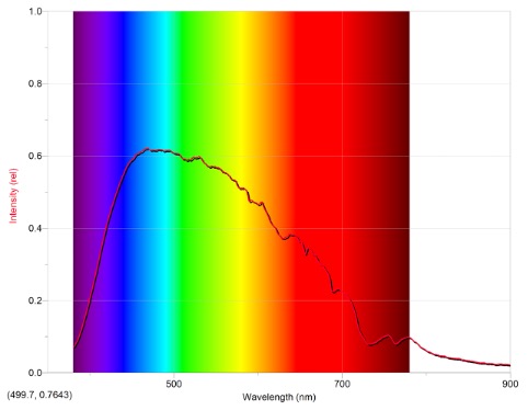The emission spectrum you see plotted is not a calibrated emission spectrum. That is, because the intensity at wavelength A is double the intensity at wavelength B, we cannot say that the energy delivered at wavelength A is double that delivered at wavelength B. The intensity is really a combination of how much light there is at that wavelength and how sensitive the detector is to that wavelength. If you always use the same instrument, you can compare the relative intensities at different wavelengths. For example, the widely reported phenomenon of the sky turning bluer as the eclipse approaches totality should show up in these spectra. The relative height of the blue intensities should increase as compared to the red wavelength intensities.