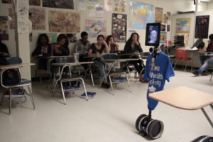 Because the robot is mobile, students aren’t restricted from group collaboration like they might be with a traditional and less flexible video conference.